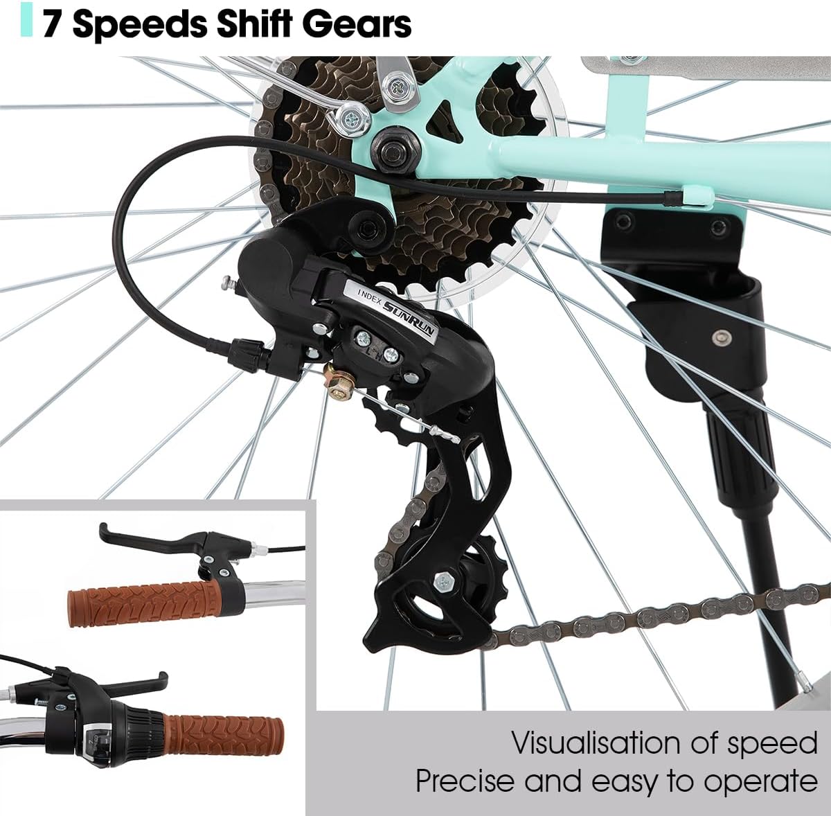 - Shifting and Braking: The V-brake system ensures efficient and responsive braking performance, a 7-speed gear system provides sufficient flexibility to handle various riding conditions